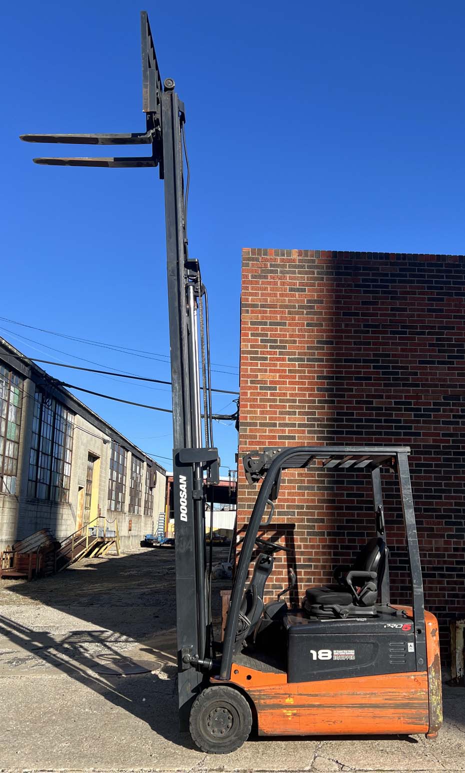 Full free lifting mast with sideshift capability, power steering, smooth electronic controls and strong 36 volt battery included!